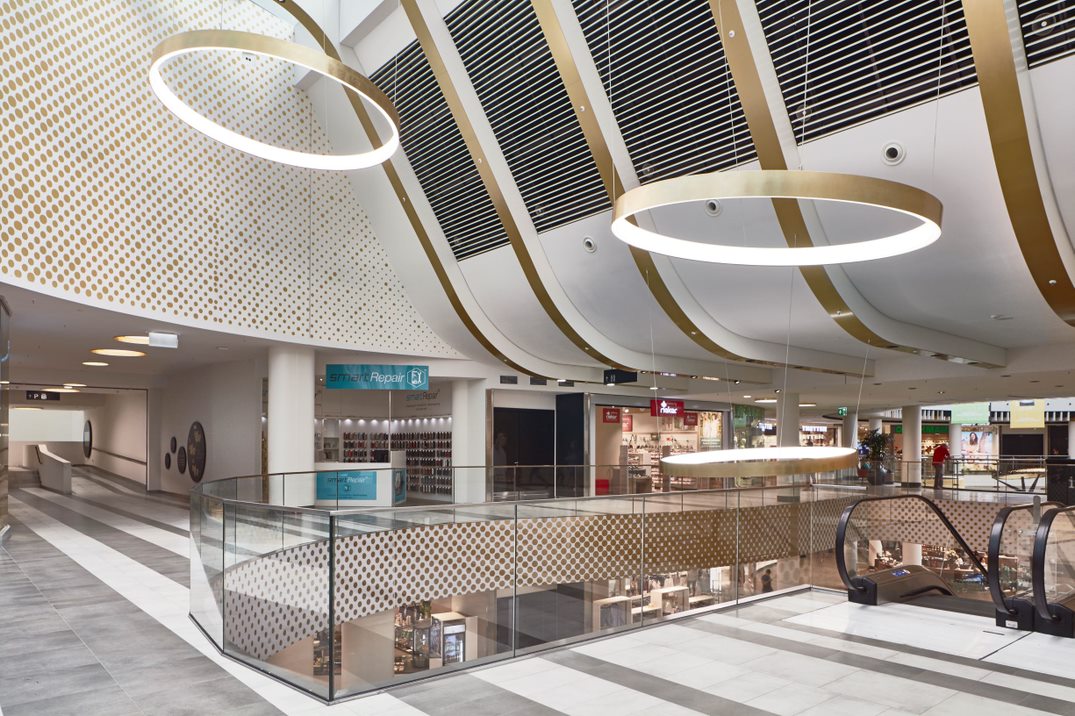 gestalterischen Ausführungen und Lamellenbeleuchtung mit perforierter Abdeckung für einen lebendigen Gold-Effekt der Lamelle. Der gesamte Mall-Bereich ist mit tuneable white und einer tageslichtabhängigen Lichtsteuerung ausgestattet.